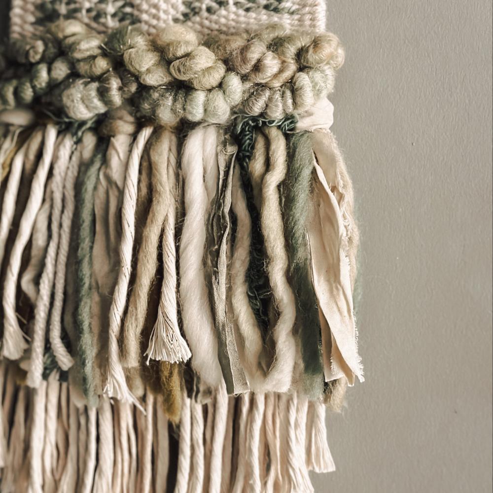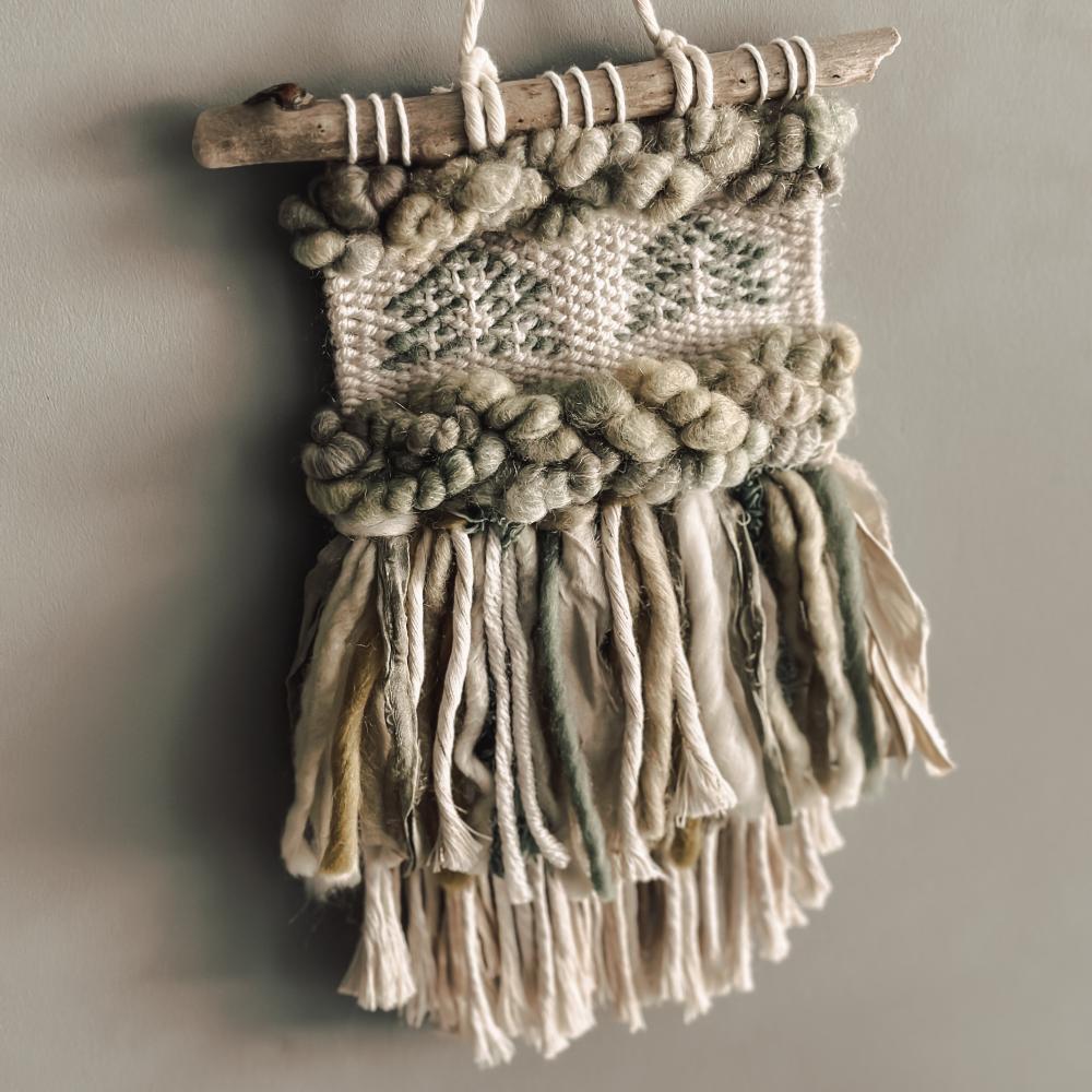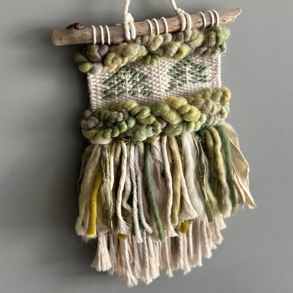 تعليقة جدارية من فن النسيج مصنوعة يدوياً و تحتوي على خيوط مغزولة يدوياً و مزينة بنقش الدِلم.